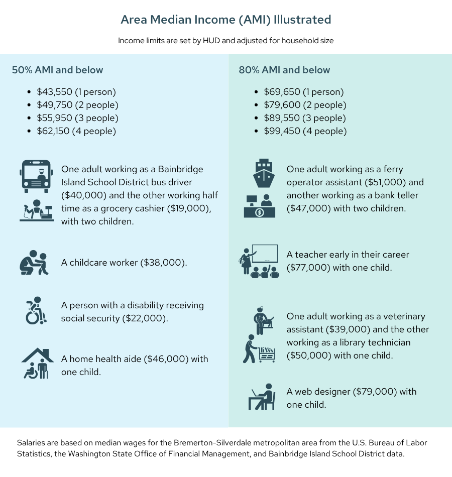 HRB and other affordable housing providers use the area median incomes determined by HUD. HUD begins by calculating the area median income for a family of four in a specific region (in our case, all of Kitsap County). It then adjusts this income according to family size using a special formula. These figures are used as income limits to determine eligibility for affordable housing.